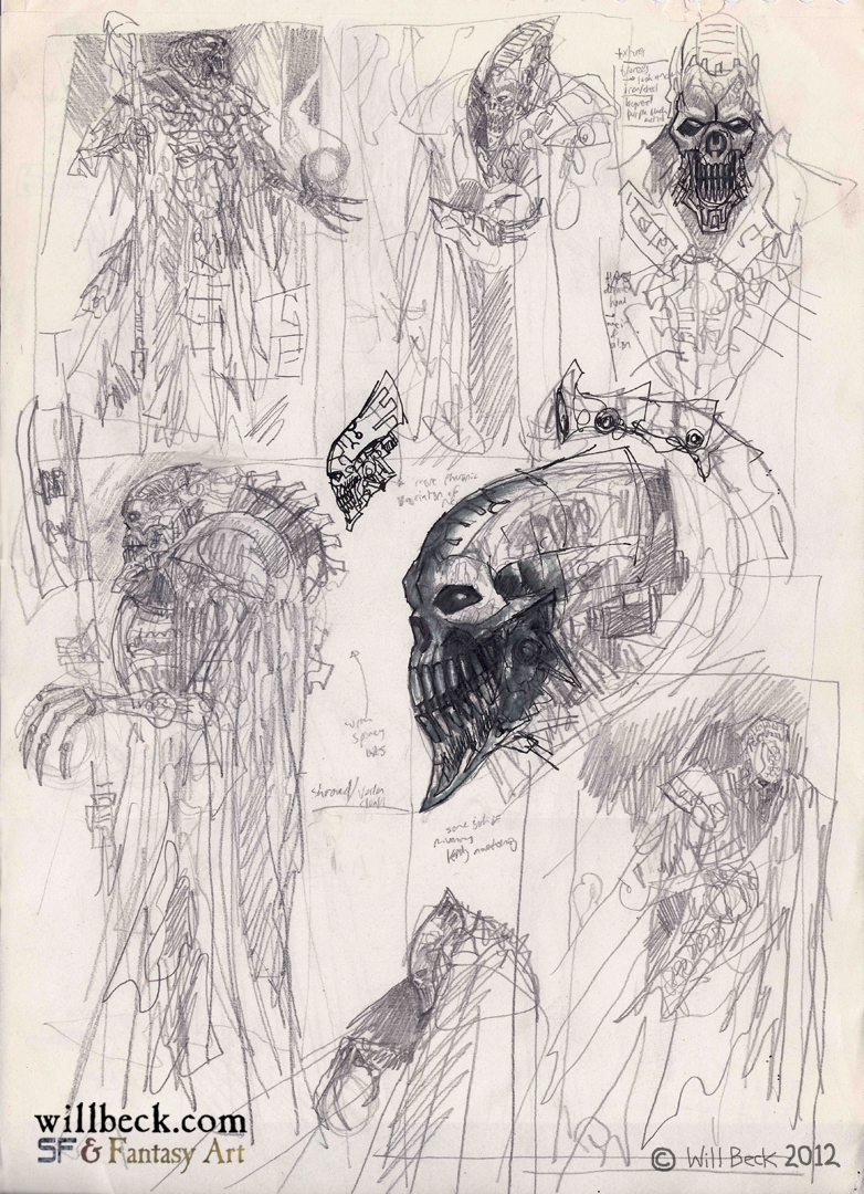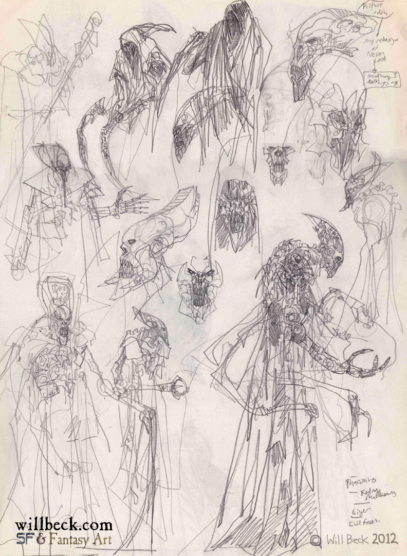 OK some more old designs for Games Workshop’s Necrons, these are from about 2004 I think. I should date these things. Again I was a little disappointed with the un-alien nature of the C’Tan beings and was attempting to inject some more weirdness. I don’t think they quite worked so I shelved the idea.