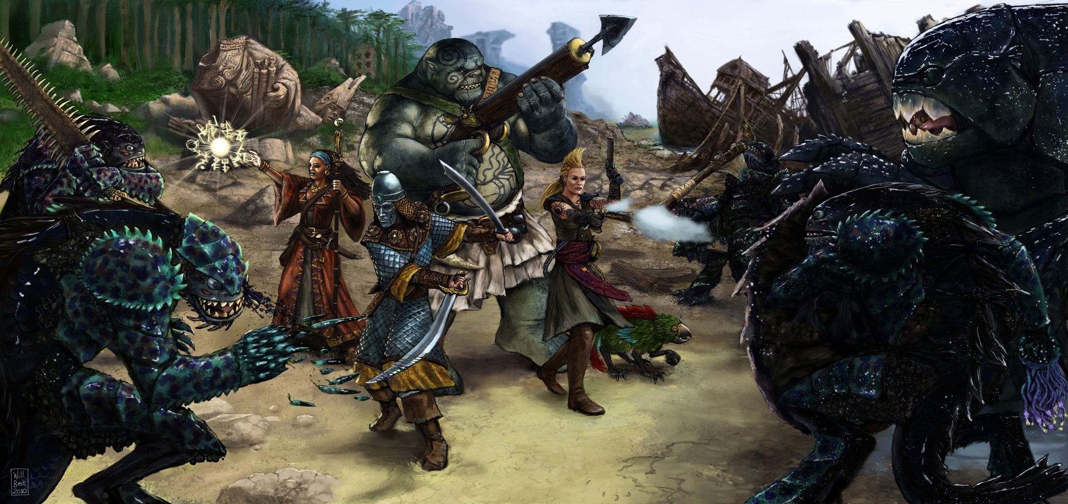 Sunken World Fight August 26, 2013 2170 × 1024 Sunken World Fight Sunken World Fight Fantasy adventurers are ambushed by fish-men amidst ruins Related Images: