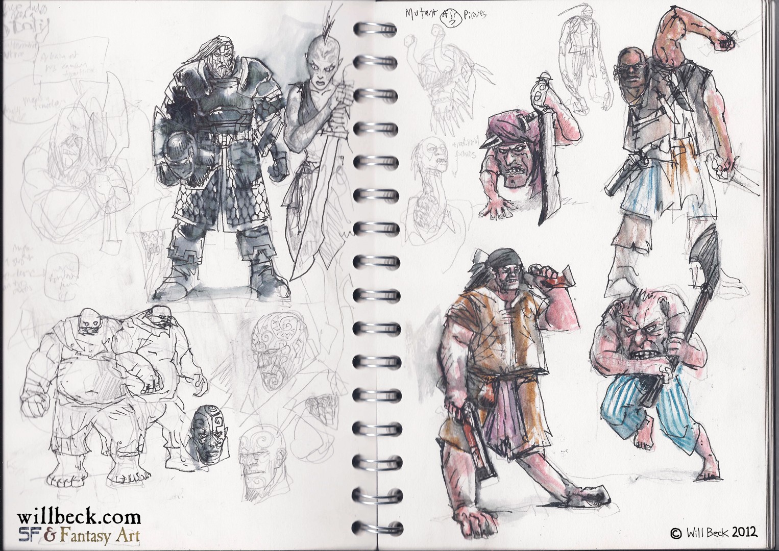 I’m working on a few things right now (not paid work alas!);  one of which is a composition involving various monsters and a Planar Alchemist.  Here are a couple of pages (A5 and A3) of designs for the archaic re-breather and dimensional-hopping devices.  The device is partly based on the Antikythera mechanism; as an historical example of an ancient computer.  http://en.wikipedia.org/wiki/Antikythera_mechanism